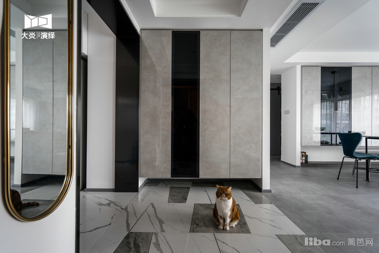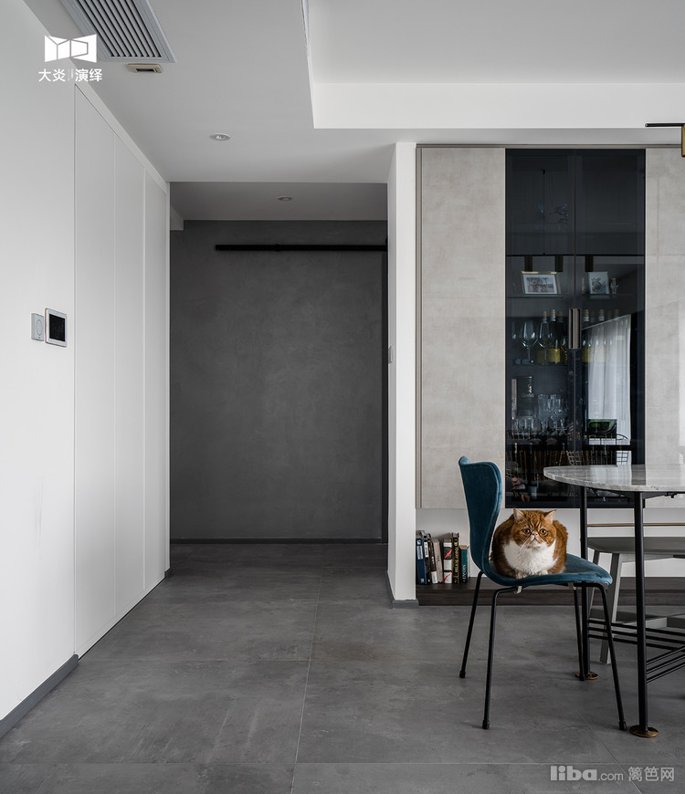餐厅侧面过道区设计了整面的白色储物柜体,
