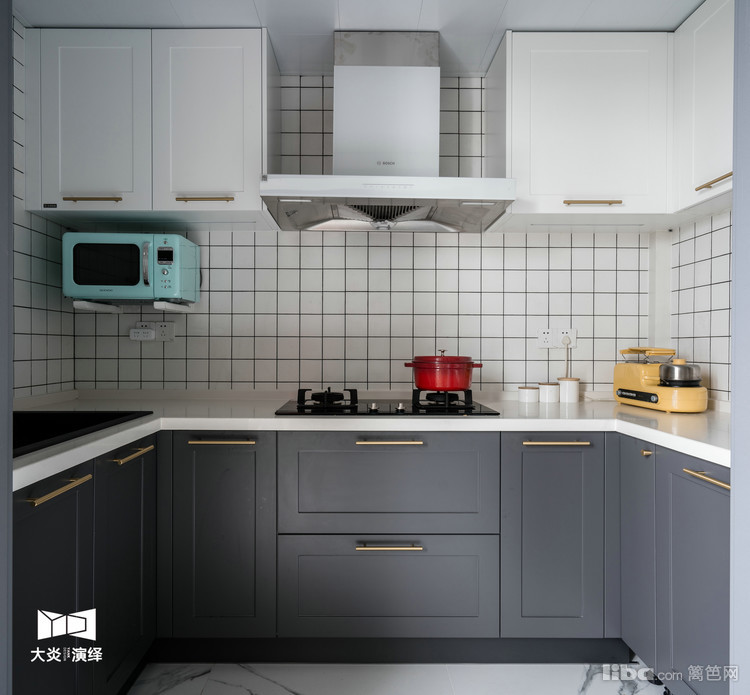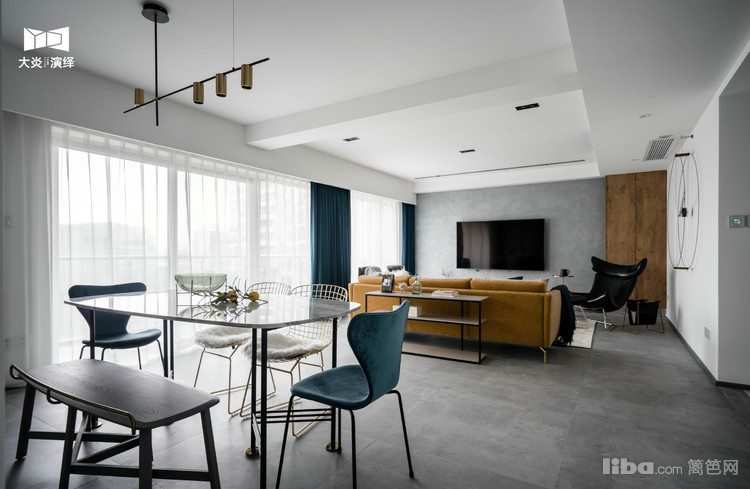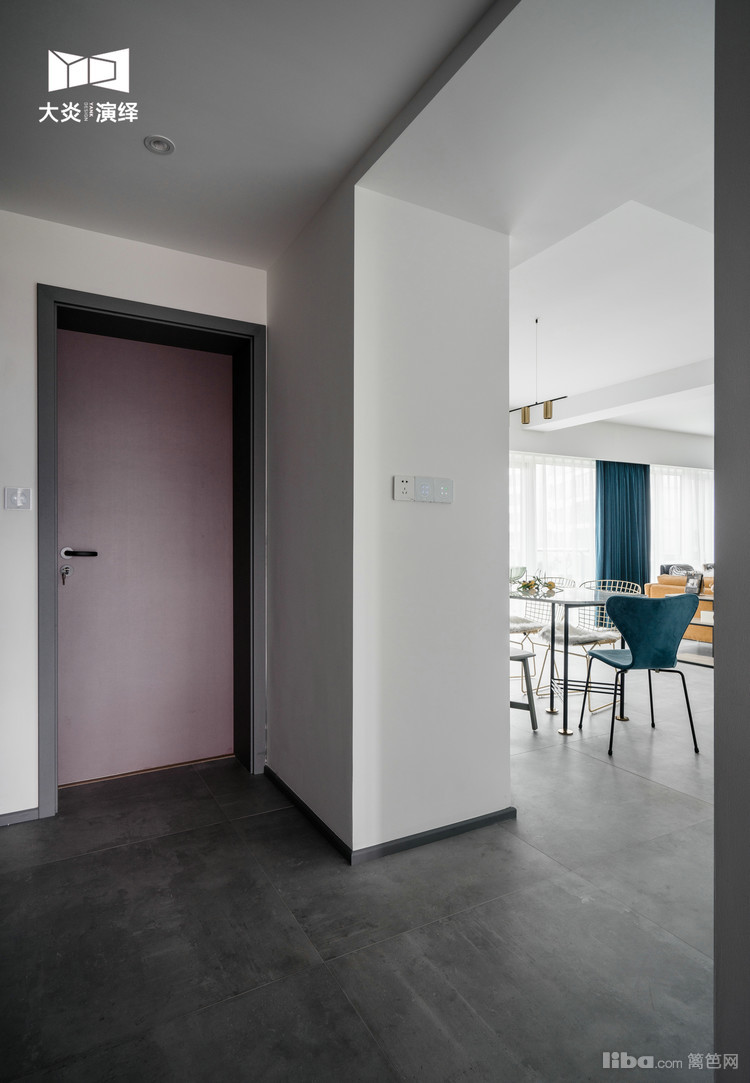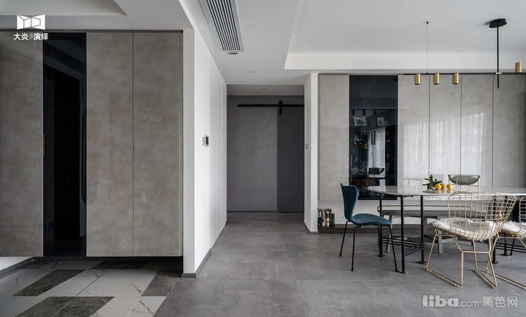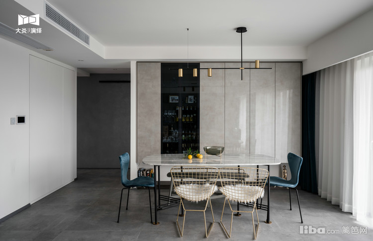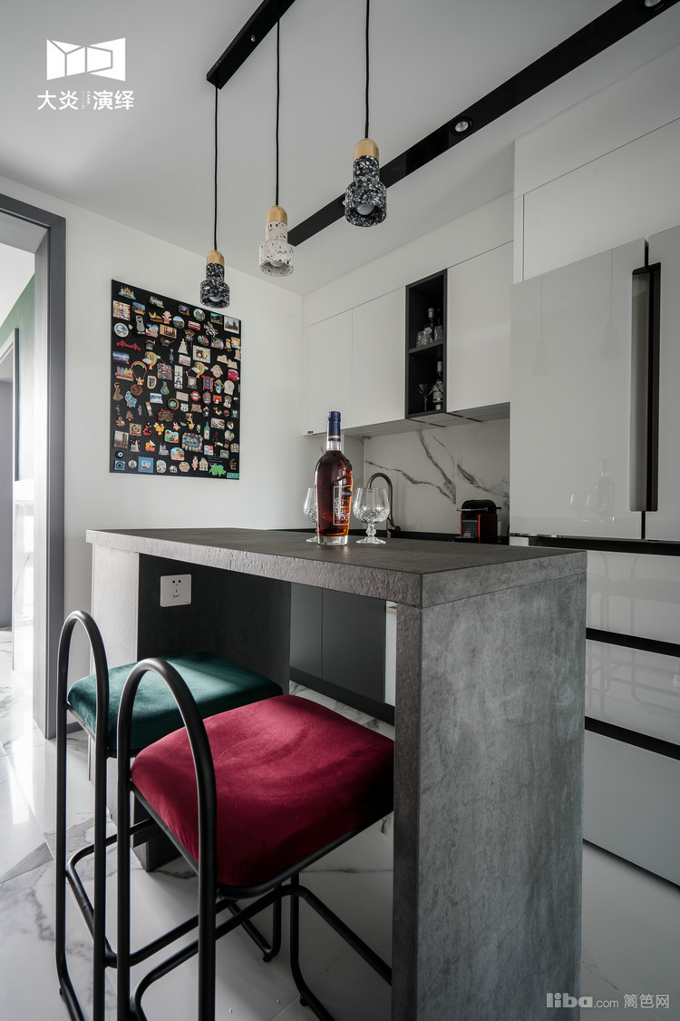 门厅左侧便是西厨和小吧台,水磨石材质的吊灯、复古色绒面铁艺吧椅,搭配仿水泥质感的面板,营造小小的工业感~