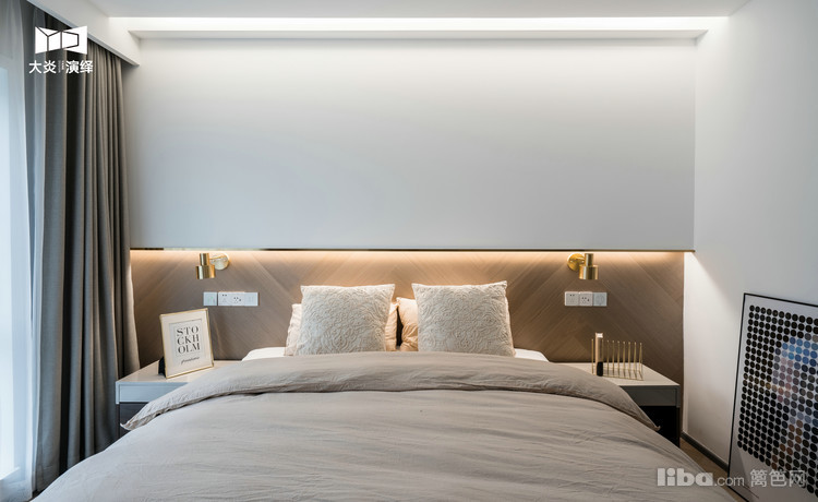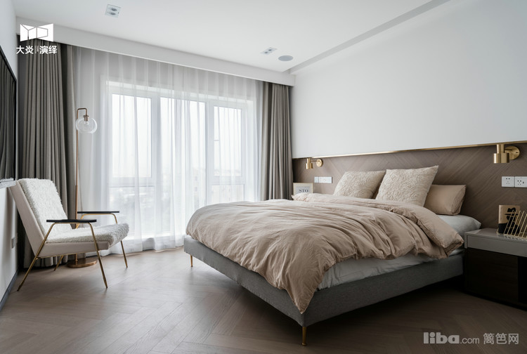 套房形式的设计,人字拼地板半墙设计有种空间的延伸感,金属元素的灯具更好的在素色系床品中凸显轻奢感;