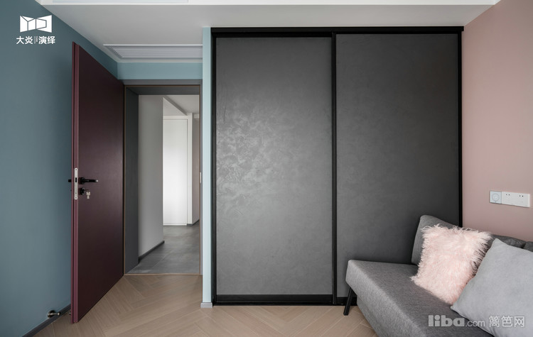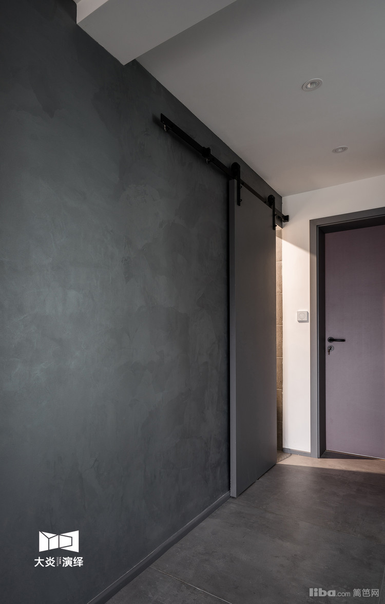 通往卧室的过道一面刷了男主最爱的水泥漆,同色的谷仓门内是小小的洗衣烘干间;