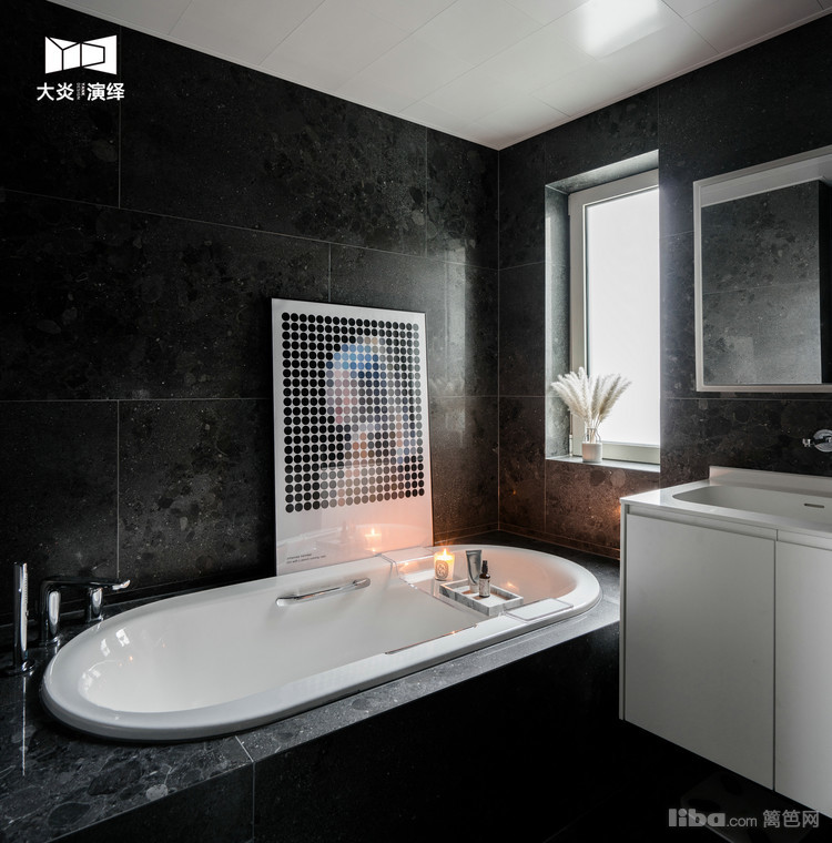 黑色主题的主卫,马桶挂壁、龙头入墙的设计使空间更简洁;对于经常加班的人来说,睡前泡个热水浴是多么减压和惬意的事儿,