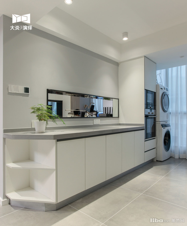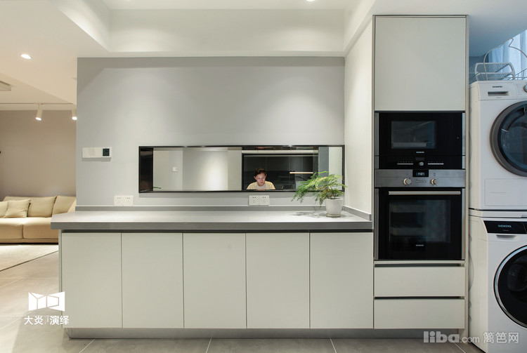 原餐厅加阳台改造而来的西厨和洗衣区;墙面的长方形洞,可以满足业主在厨房、西厨与餐厅的零距离沟通,