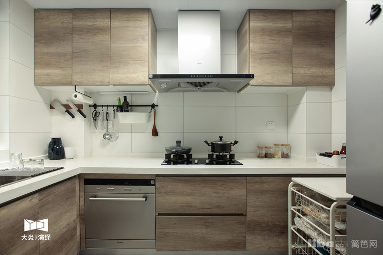 开放式柜体设计,搭配木色面板,另一侧刚好放了双开门的冰箱和储物架,