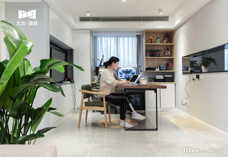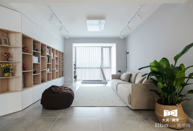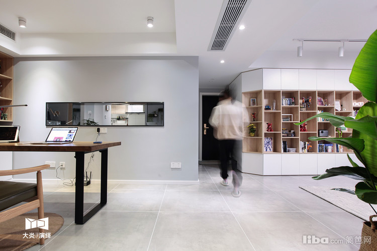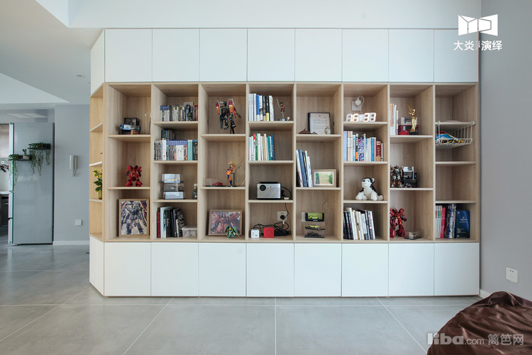 从入室的鞋柜开始延伸而来的整面书柜替代了传统标配的客厅电视墙,错落有致的摆放着书籍,汽车模型...