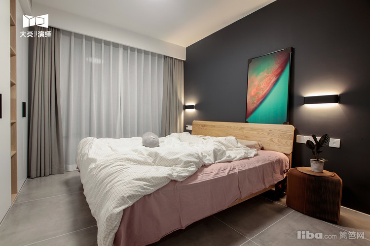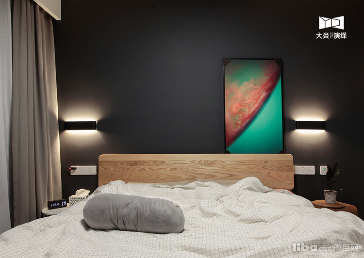 深灰色的床头墙面再搭配一副绿色的抽象装饰画,好看极了,深得业主喜欢!
