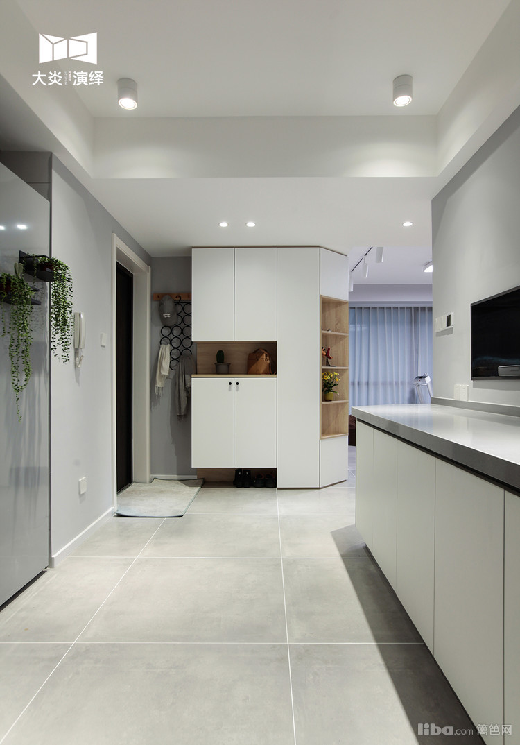 简单的挂衣区,上下式鞋柜与客厅的整面书柜一体,柜底留20cm空间可以放置日常更换的鞋子;