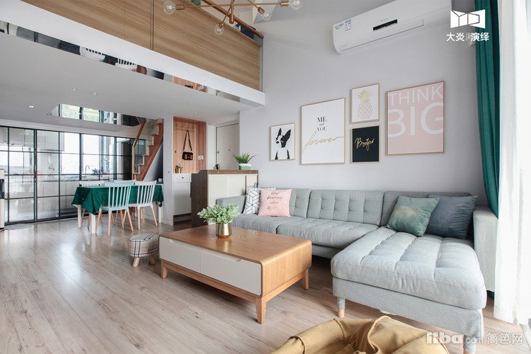 设计师便以清新简约的北欧风格,打造宽敞明亮的空间,利用挑高的客厅,以木色元素搭配浅灰色墙面,在绿色沙发、绿植的装饰下,让你一入室内便有一种轻松舒适的感觉~