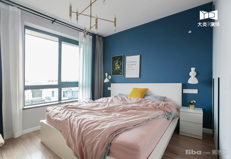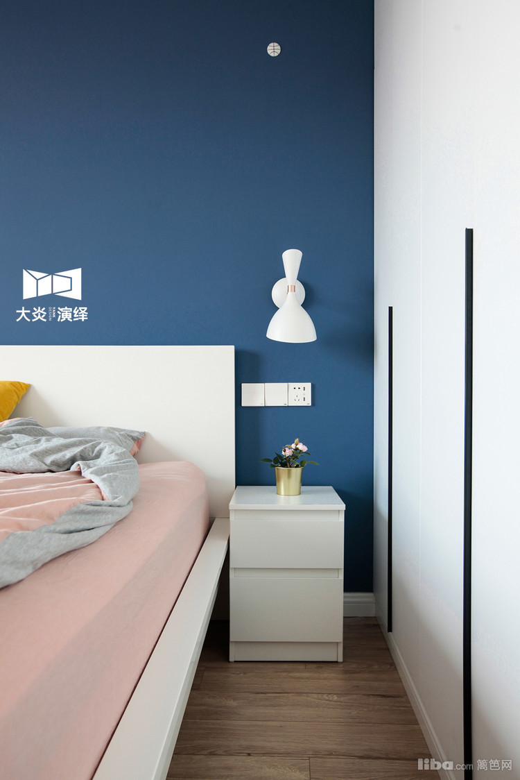 深蓝色的床头背景墙,与白色家具的搭配可以每天沉浸在蓝天白云的舒适空间里~