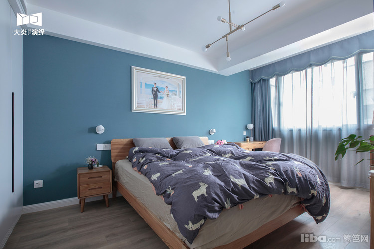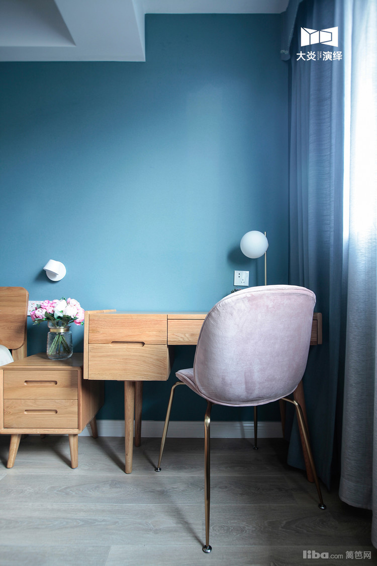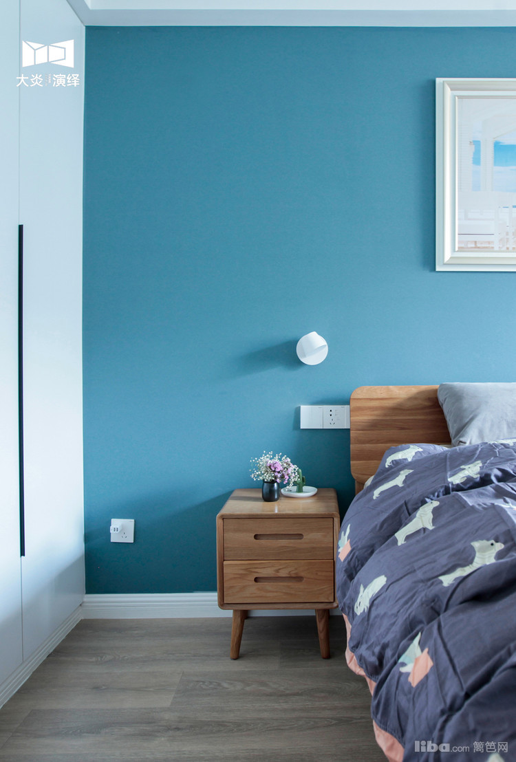 再水泥粉刷,贴网格布等也是一大笔费用,就选择了蓝色墙布做背景,效果也不错哦!