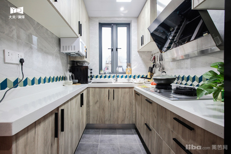 U型橱柜的设计,操作台面和收纳空间非常给力,选用浅木色的柜体,会使空间看上去更整洁!