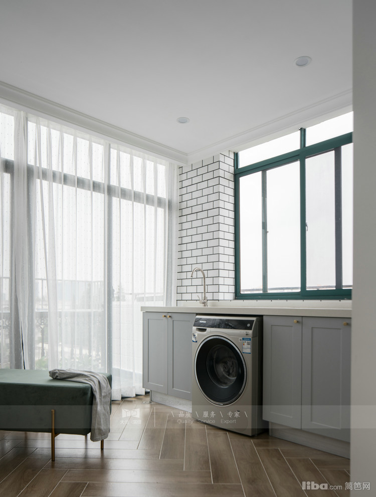 阳台洗衣间/ 该区域空间还是比较大的, 一面墙做了洗衣储物区,其他空间供自由活动,