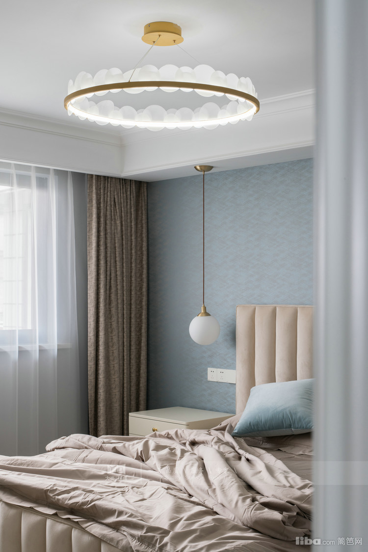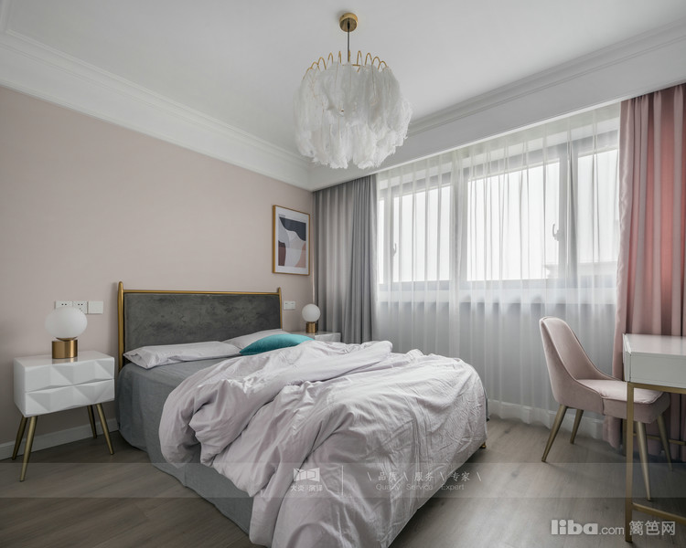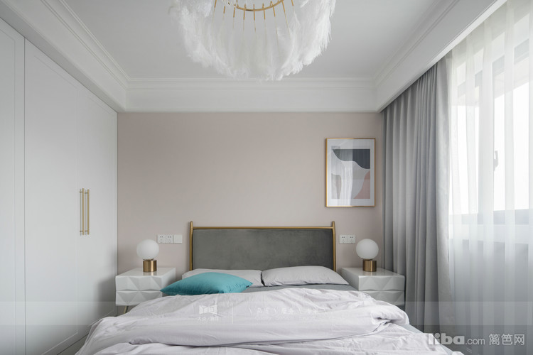 次卧/ 以粉色+白色+金属色为主的装饰, 在纯白轻盈的羽毛灯衬托下,
