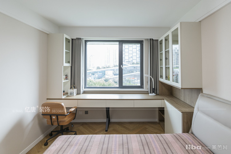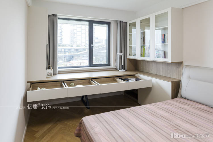 靠窗增加悬空通铺书桌,满足梳妆台和办公多重需要,居家办公必备