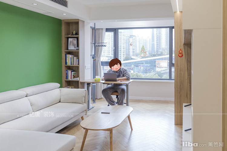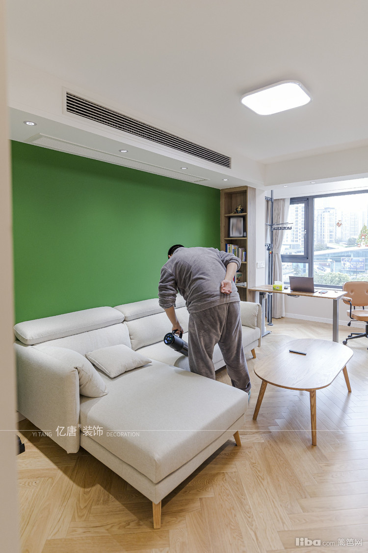 绿色的沙发背景墙,搭配原木色的小茶几,以及浅色的布艺沙发,清爽自然、温柔清新。