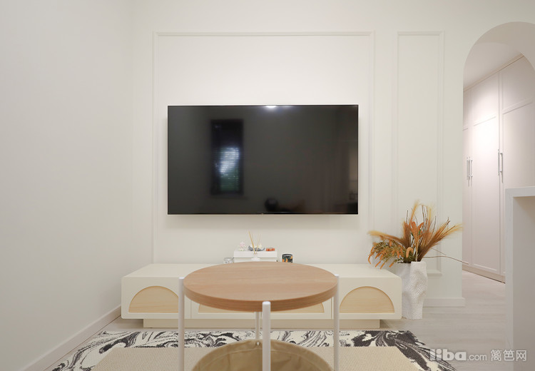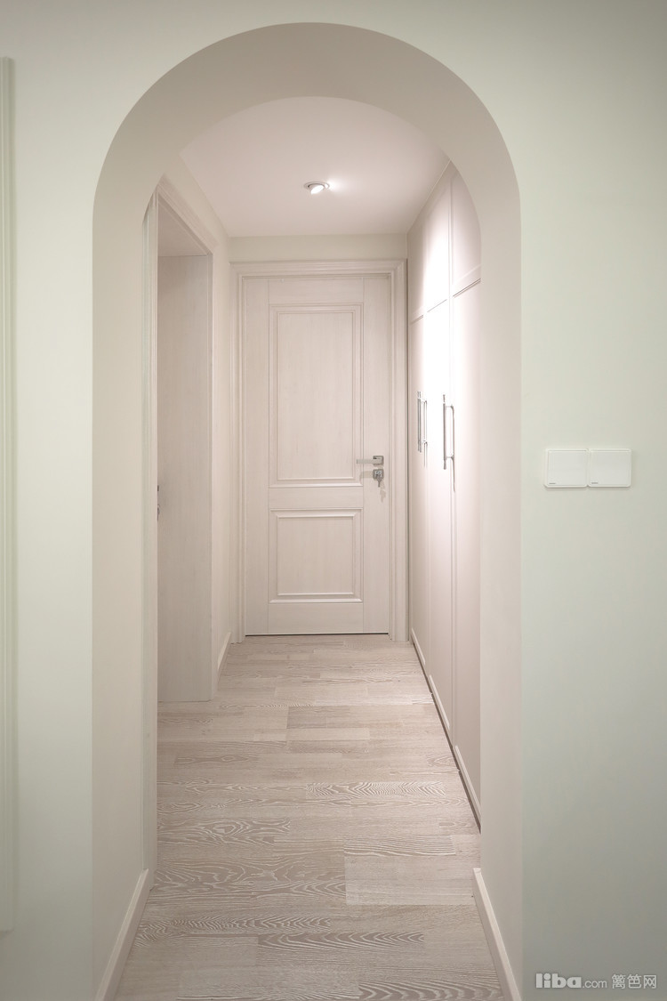 穿过餐边柜旁的拱门,来到主卧和次卧休息区域,在这个过度区域做了一个收纳薄柜,可放置清小件物品,同时也能做个装饰。