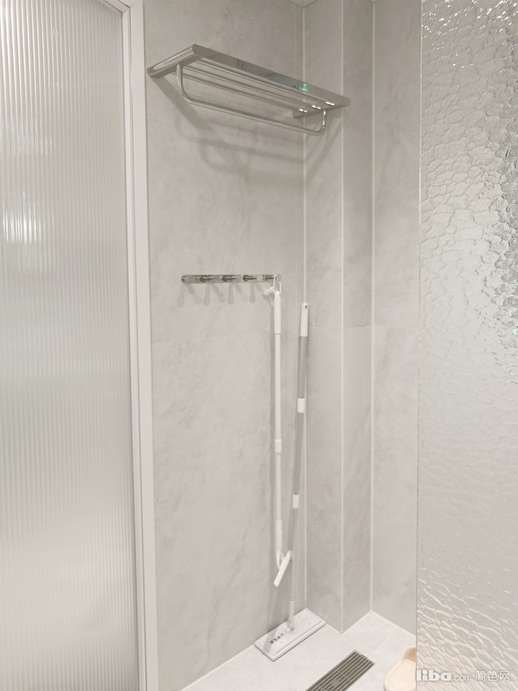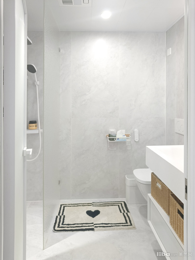 卫生间空间大小不变改变门洞位置,淋浴房做磨砂玻璃格挡,墙面大砖铺贴+白色美缝,卫生间虽小却精致。