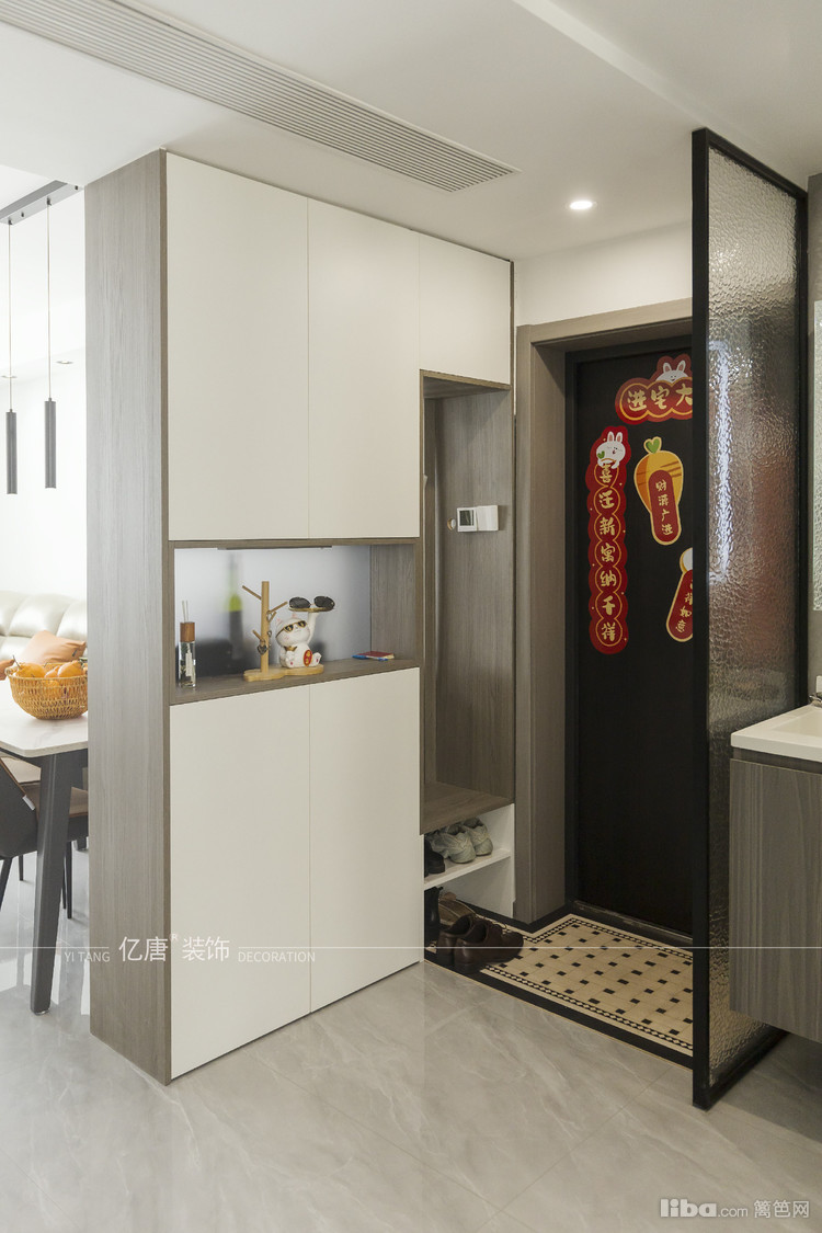 原始户型是没有玄关的,只有卫生间旁边的活动鞋柜,与空间格格不入,改造后,我们定制玄关鞋柜,设计挂衣区,换鞋矮凳,和鞋子收纳区域