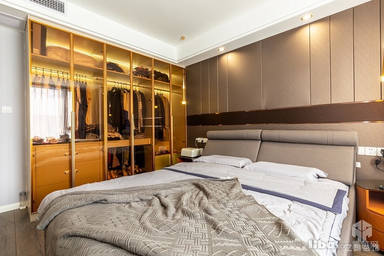 卧室背景墙以卡其色硬包+金属条装饰,优雅舒适。