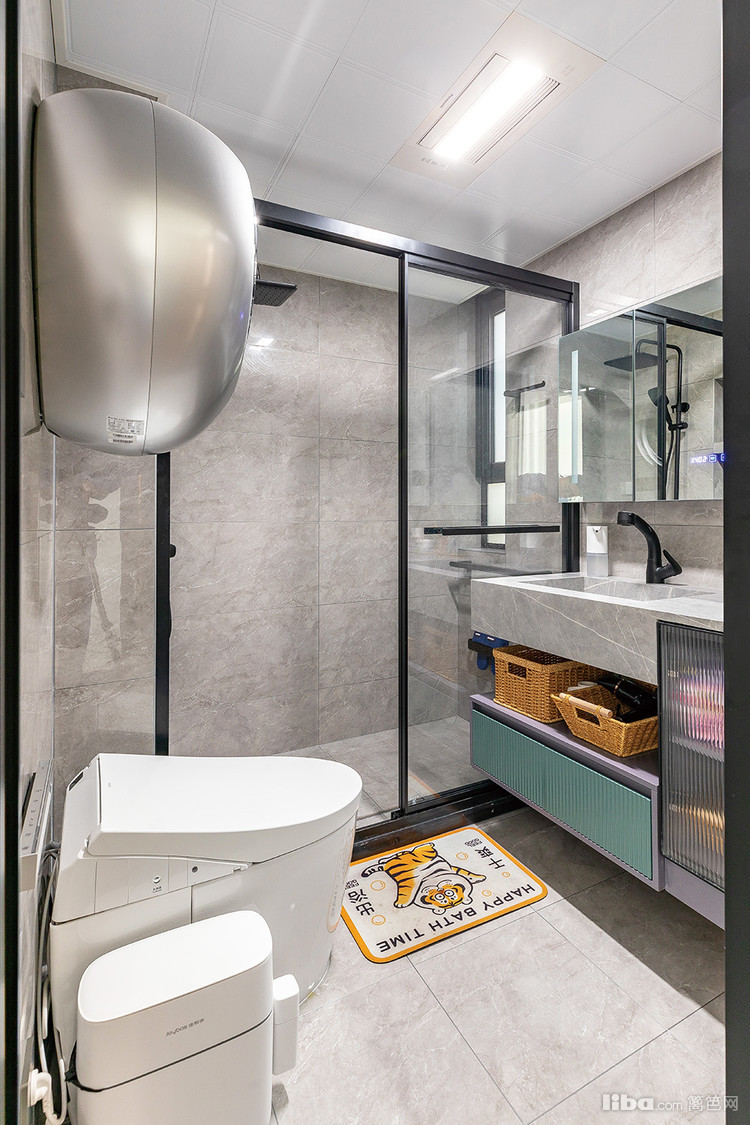 主卫干湿分离,长方形洗浴间做了岛式排水。悬壁式洗手台配备智能镜;智能感应马桶上面悬挂了小型洗衣机。