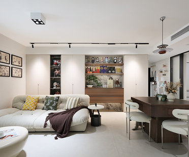 设计师推翻所有原有结构功能分区进行重组,共通的客餐厅和书房内退的阳台开放式厨房等等,功能区全部朝南
