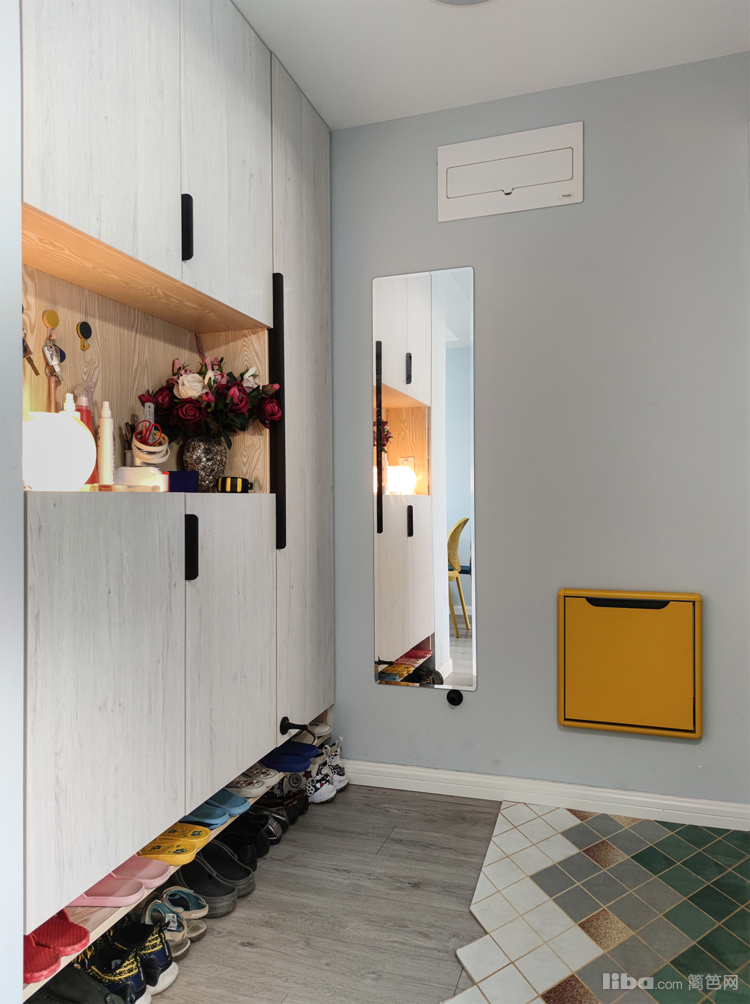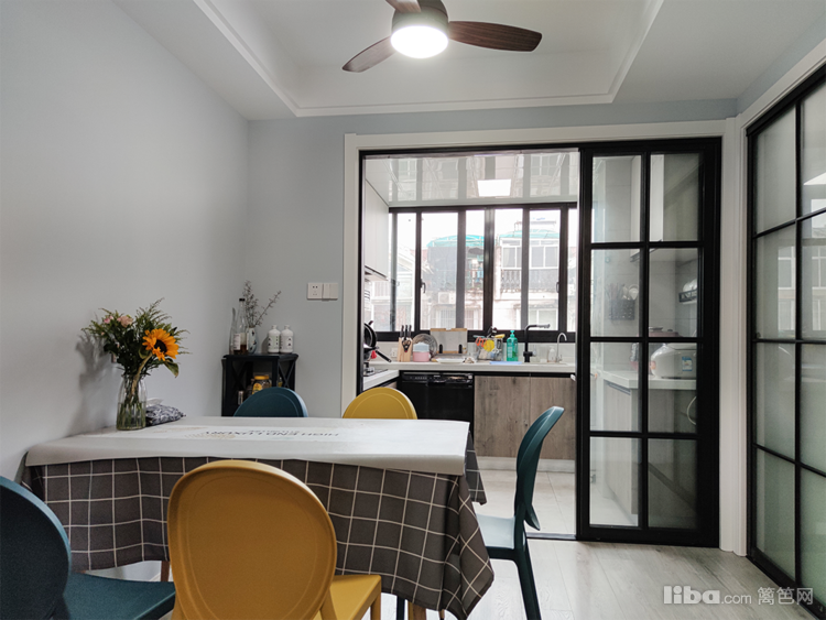 本案主打轻柔色系,浅灰色布艺沙发、彩色抱枕装扮显得活泼灵动,客厅的采光极好,几缕阳光透过窗户,照射出鲜花的弧度,自然的芬芳铺满房间。