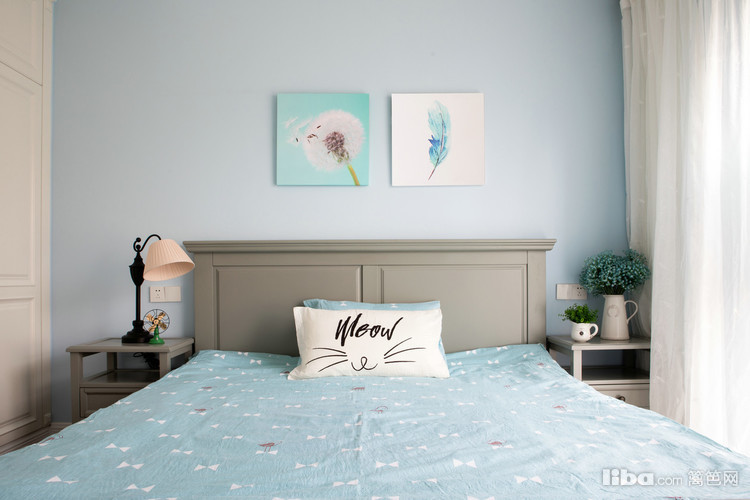 考虑到卧室用色上不宜过暗,所以在色彩上利用原木色、蓝色、白色,三个色彩相互融合,时尚又具有层次感。