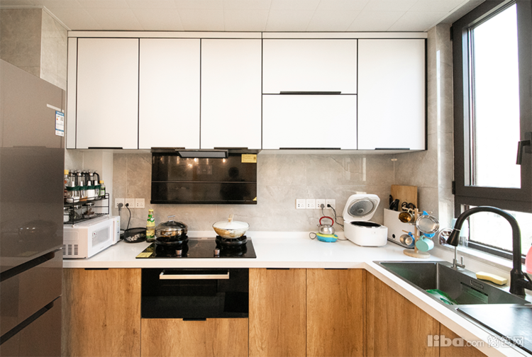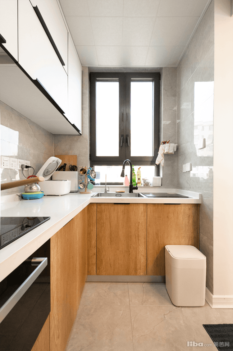 玻璃推拉门后是他们制作美食的中厨区域,白、灰、原木色依然是空间的基调,在充足光线的调和下,呈现出柔和且富有层次的美感。大容量橱柜,完全可以使得厨房不会被一丝杂乱打扰气氛。
