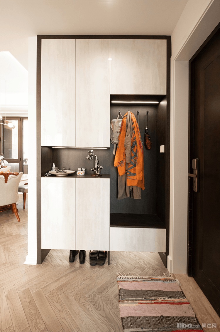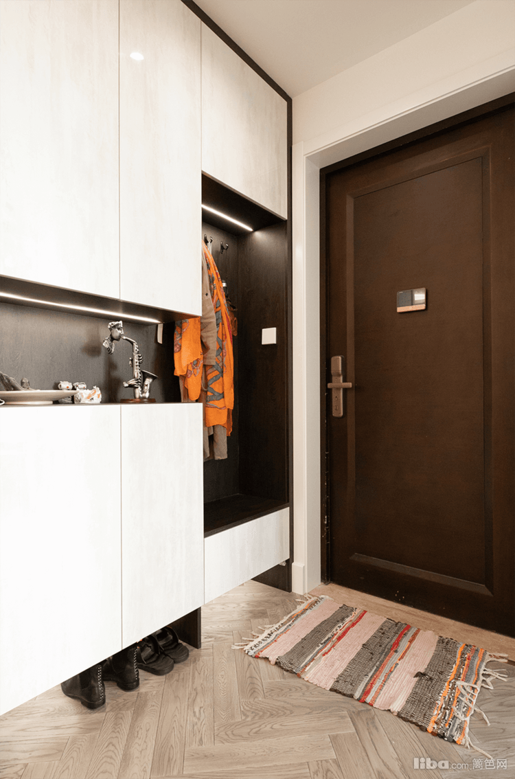 通过对屋主描述的基本需求及生活日常,打造将鞋柜、储物柜、换鞋区为一体的柜体造型。