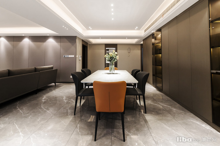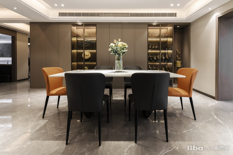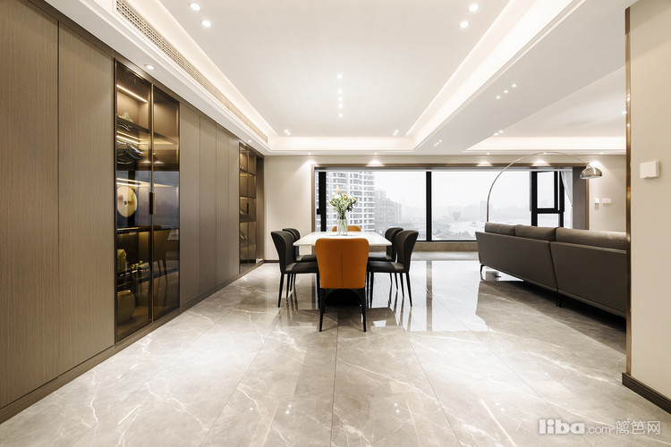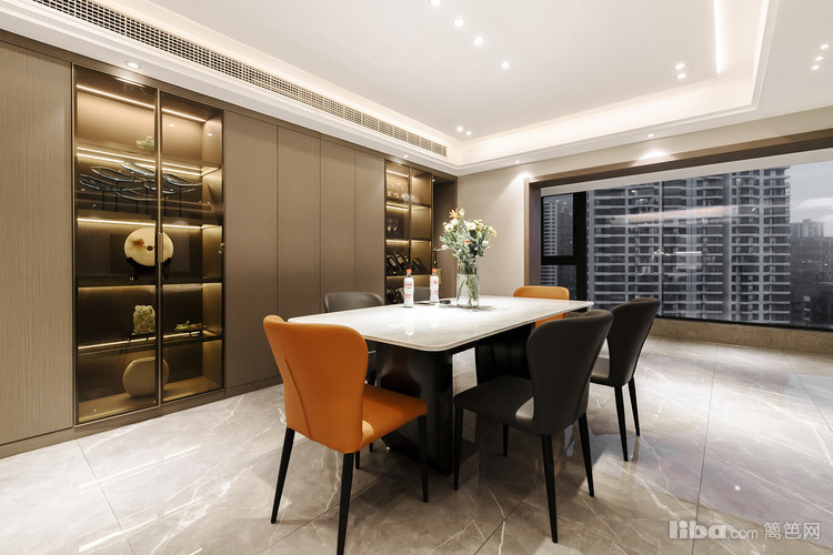 餐厅墙面的金色放射状抽象画和铜质的定制柜,也给整个用餐区域增添了一些贵气
