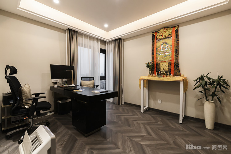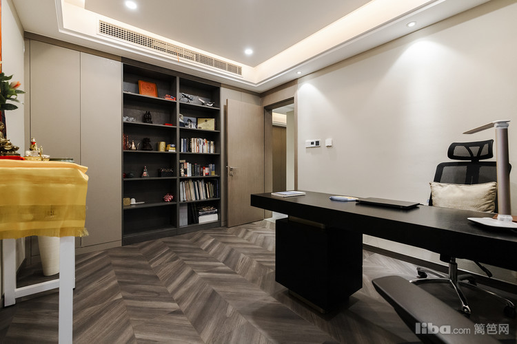 书房里,书桌本身的造型和桌面上的摆设有几分英国绅士的味道——洗练,复古,还透着几分时尚。背后大尺寸的挂画,简单几笔构成的抽象画让书房里多了些飘逸。