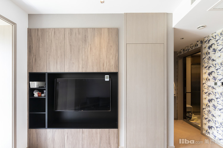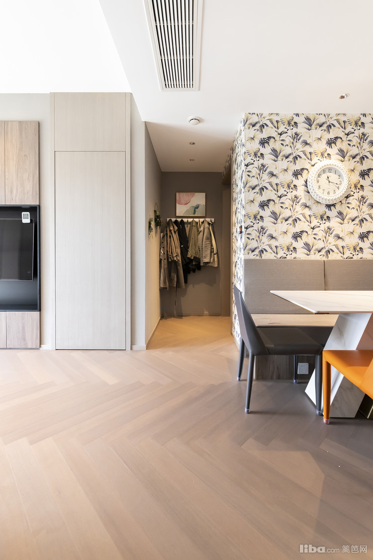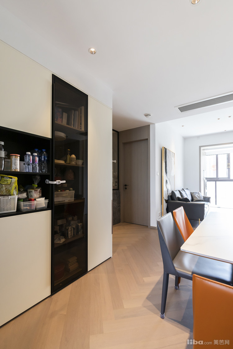 由门厅进入,一侧嵌入整排柜体,搭配纤细木拉手,带入些许清新自然基调
