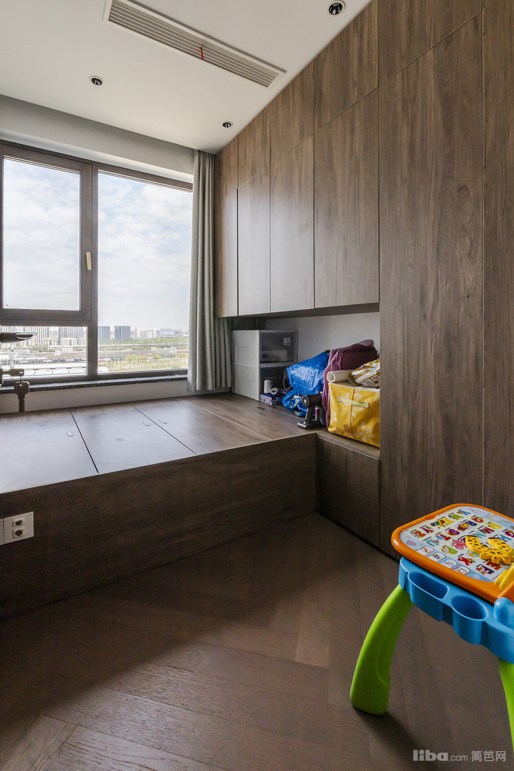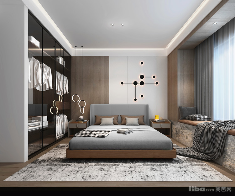 卧室的色系延用客厅的色系,在木色的空间里,提亮整体的色调,让空间备显柔和之感,黑玻璃彰显格调,带来极致美学的观感。