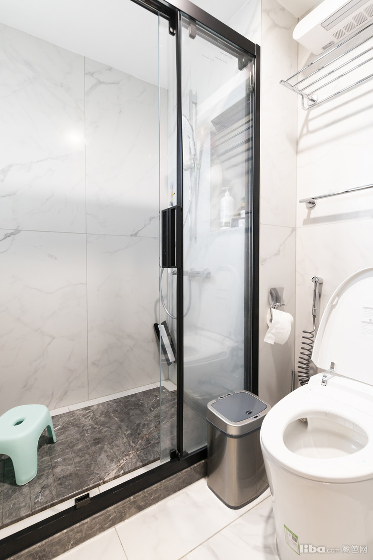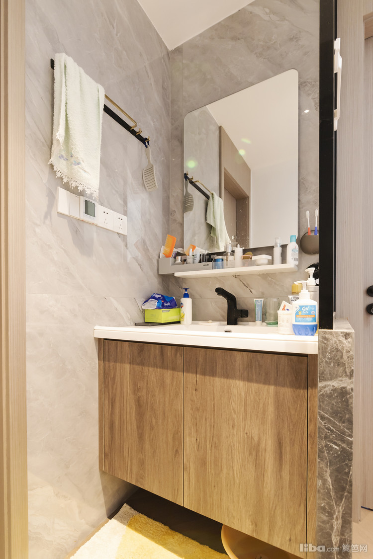 卫生间采用地面采用水泥砖铺贴,墙面铺贴浅色瓷砖,增加空间视觉延伸感,放置单人台盆,颜值与实用性得以兼顾。