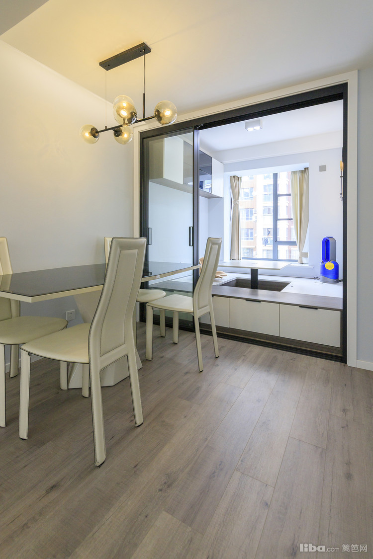 简简单单透明的玻璃隔断让餐厅和书房完美融合,整个采用了“无界”的概念,无边框,当夜晚降临,从宽大的灰色玻璃中透出橙色的光,让它成为家里的一颗小种子,静静地包裹着伏案的人。