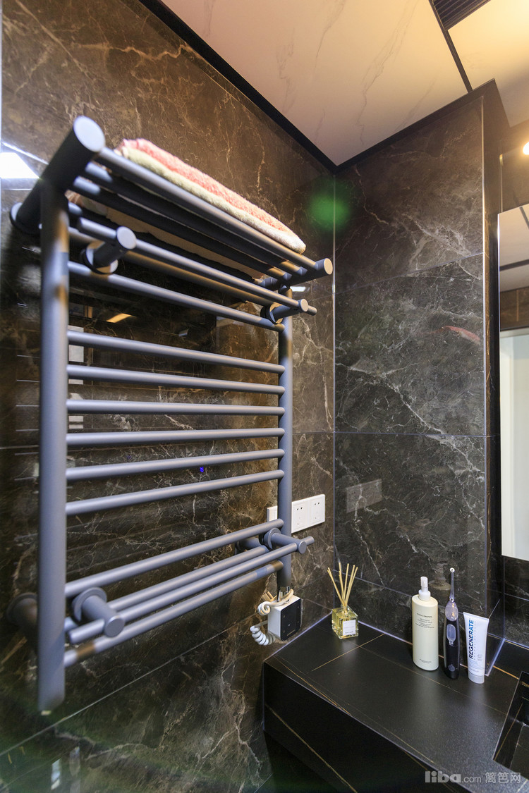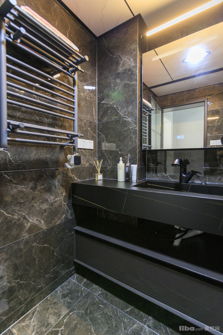 卫生间采用与厨房相统一的色调,“暗黑色系”更加大气