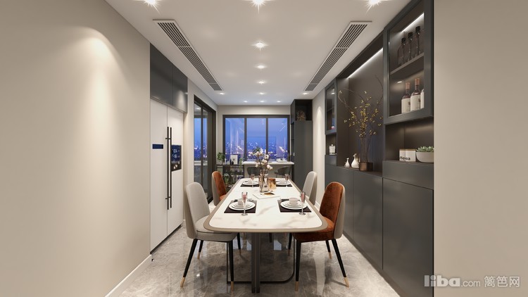 电视背景墙采用爵士白大理石整体看上去简介大方,客餐厅吊顶采用无主灯设计,结合当下潮流局部使用了线性灯