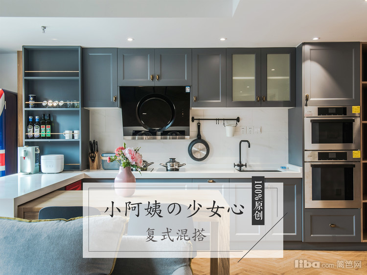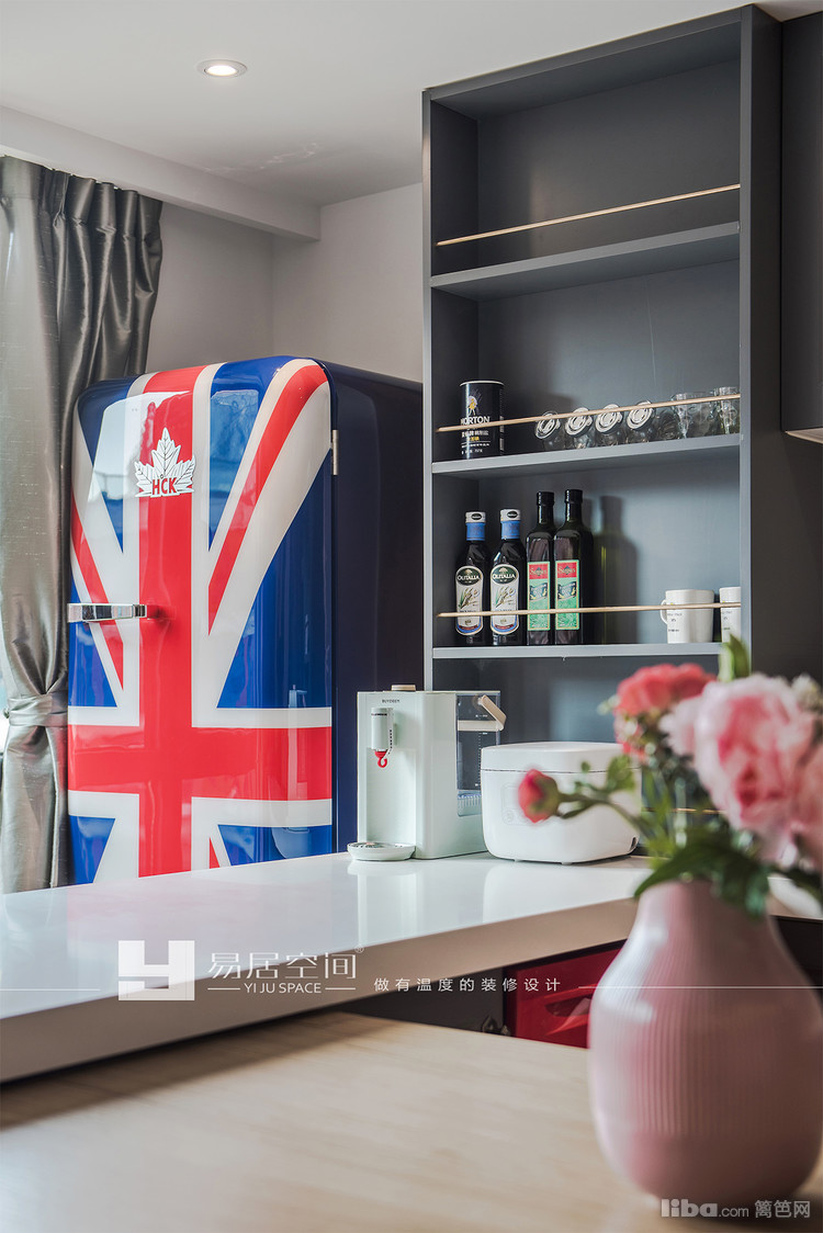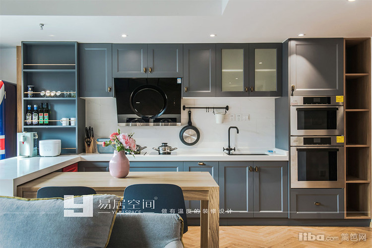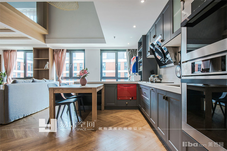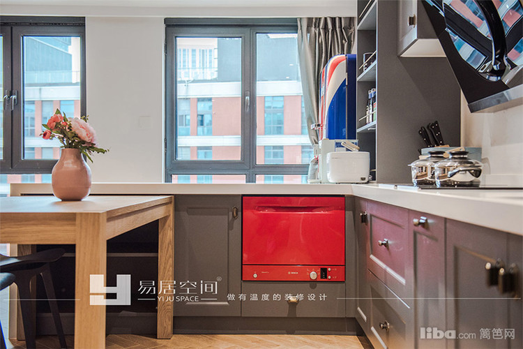 开放式的厨房连接了吧台和餐桌,这样就相当于多了一个餐厅,厨柜虽小,样样俱全