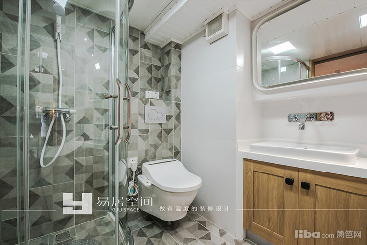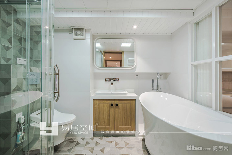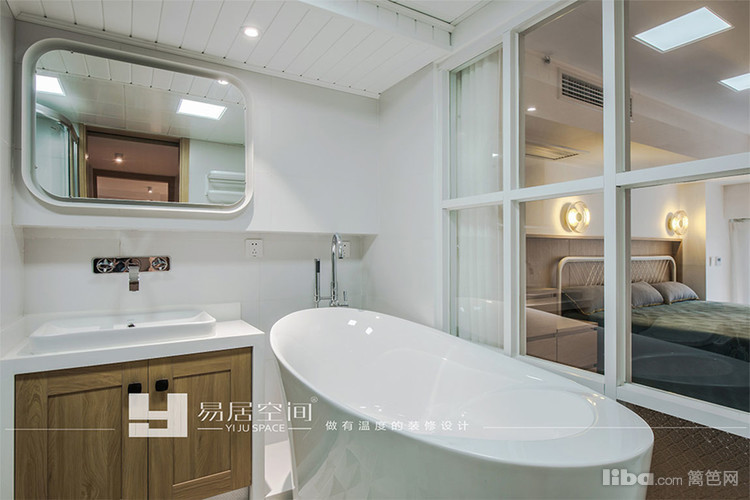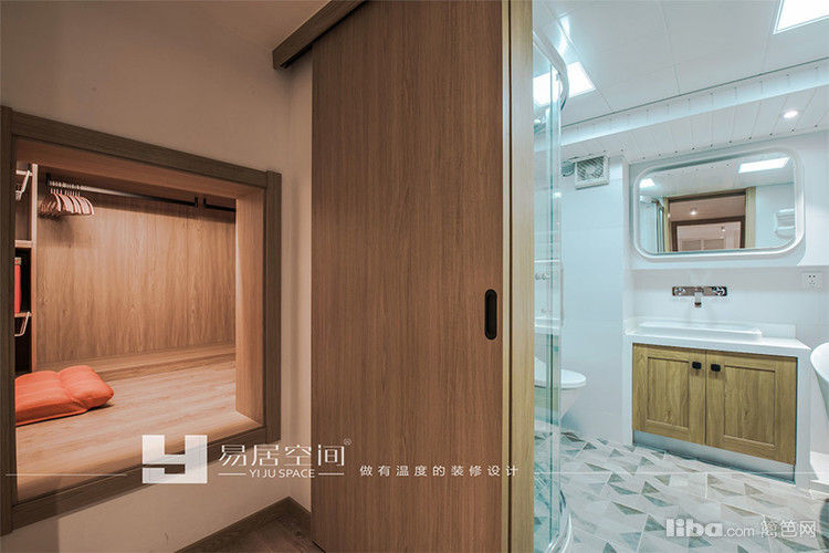 通过衣帽间是二楼的卫生间,卫生间虽小,但泡澡淋浴都不可缺少,链接卧室的墙面也做成了玻璃隔断的形式,主要以透光为主,这样白天不开灯也不会显得很暗了,加了帘子增加隐私性。