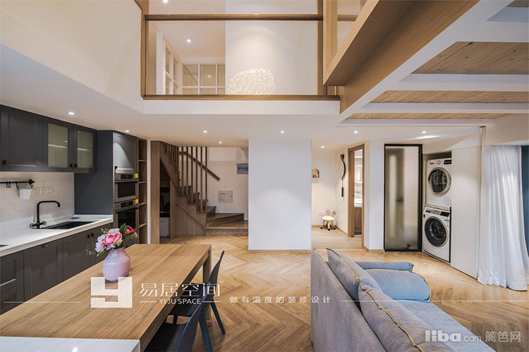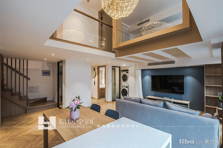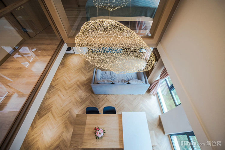复式的loft公寓,整体的一个墙体以及隔断用材以原木和玻璃为主,简单大气