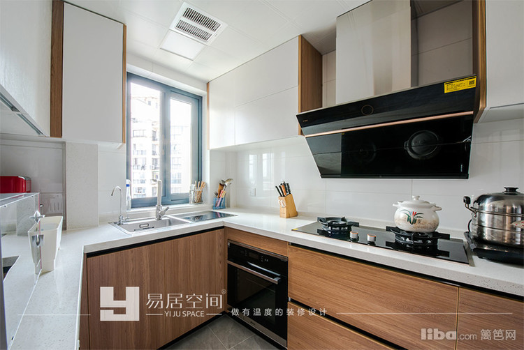 厨房当时考虑的因素就比较多了。因为业主有好多电器,蒸烤箱,消毒柜,以及一个大的双开门冰箱,尺寸上,我们碰过很多次,最后终于确定下来,在格局上空间增大了不少