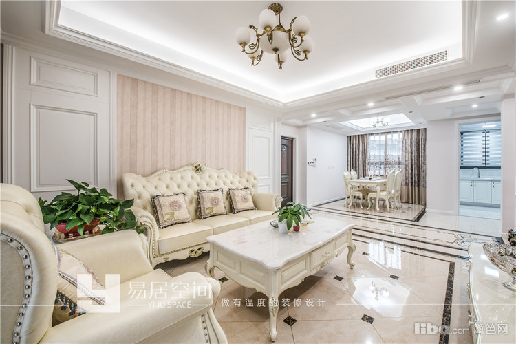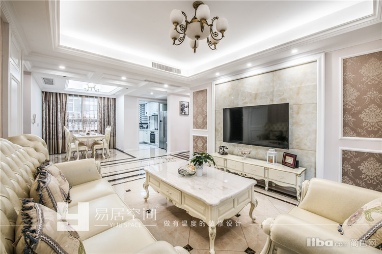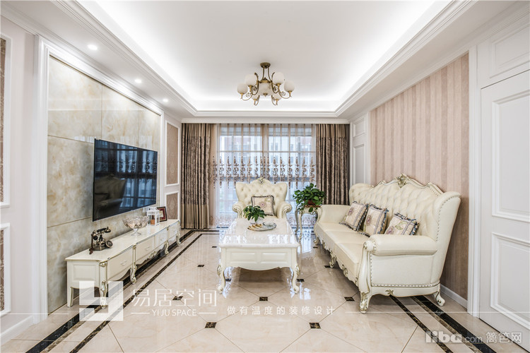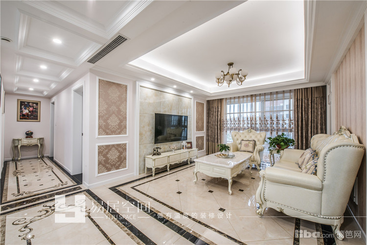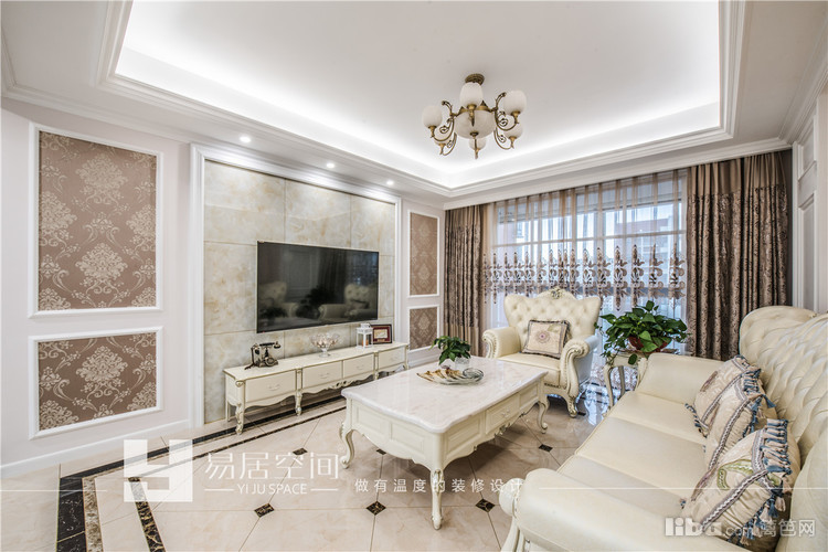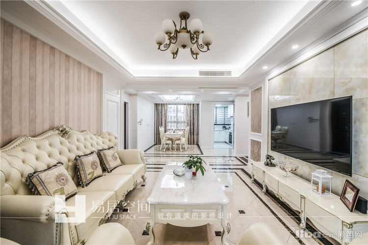 电视背景墙和沙发背景墙呼应,做了线条,中间贴的瓷砖,两边贴的壁纸。线条感把欧式氛围烘托出来。