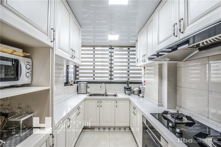 厨房原来设计的L型,后期为了增加厨房的储物,特意做了U型,这样就给了微波炉这些电器柜有了一个归宿。