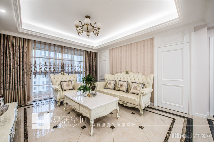 整个客厅颜色以浅色为主,欧式的沙发和置物架摆设,让整个客厅有了欧式的感觉,配上带有色彩的靠枕,欧式奢华尽显。