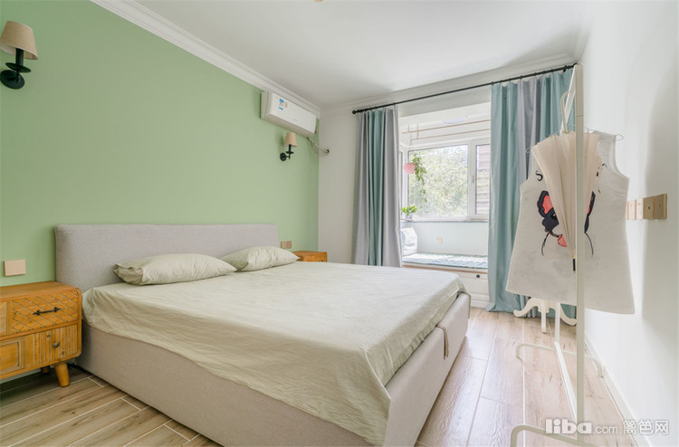 主卧室墙面粉刷整面浅豆绿色,搭配灰色靠背的双人床。
