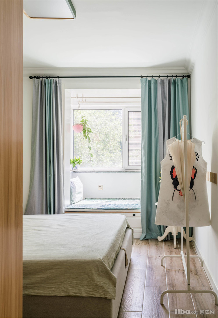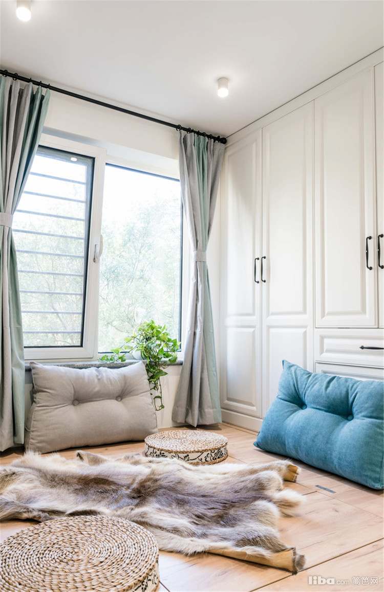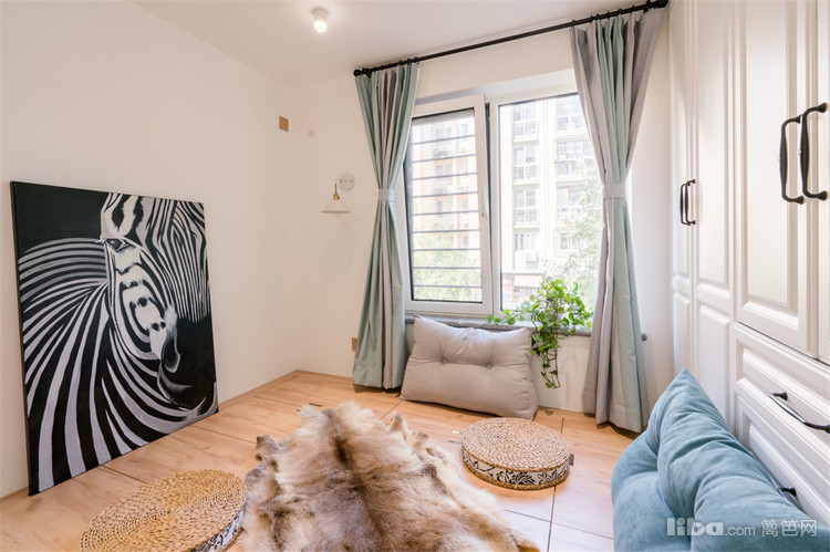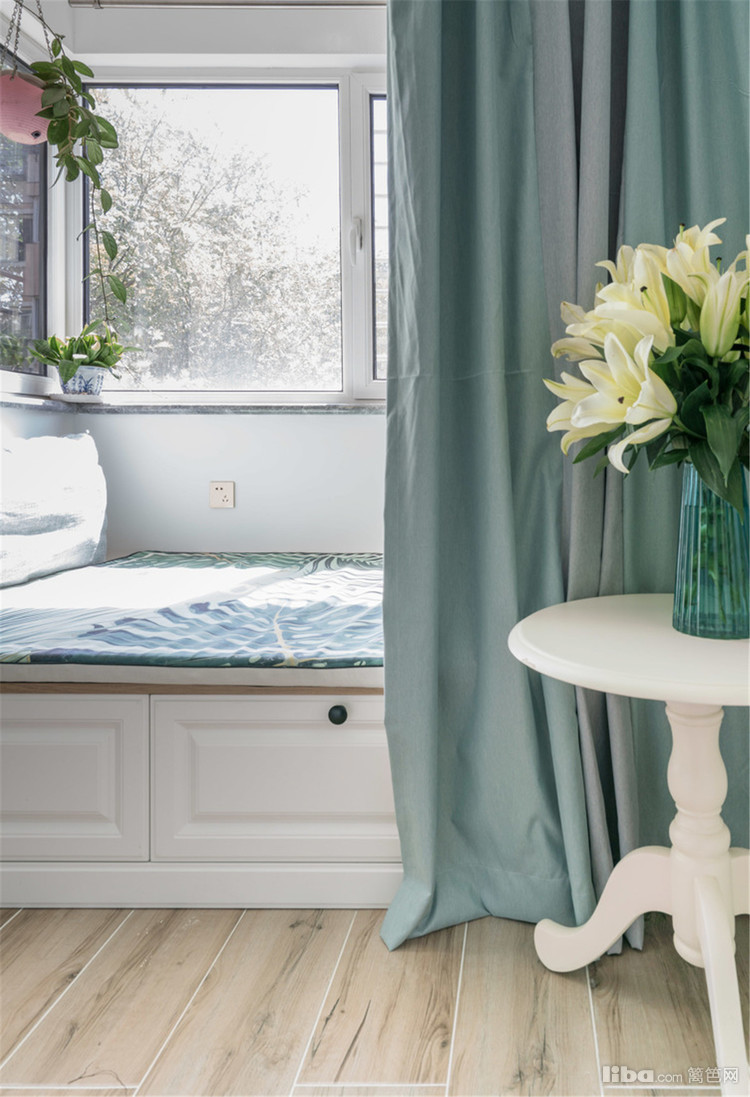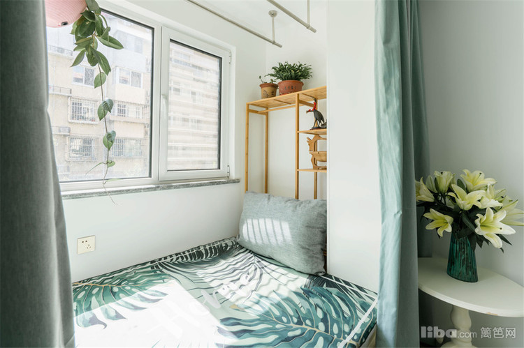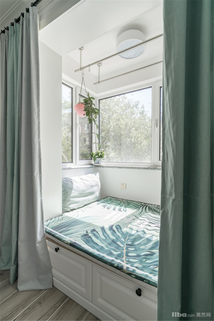 主卧室阳台,拆除了原来的玻璃推拉门,空间更通透。地面定制了抽屉柜做地柜