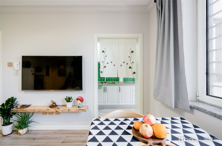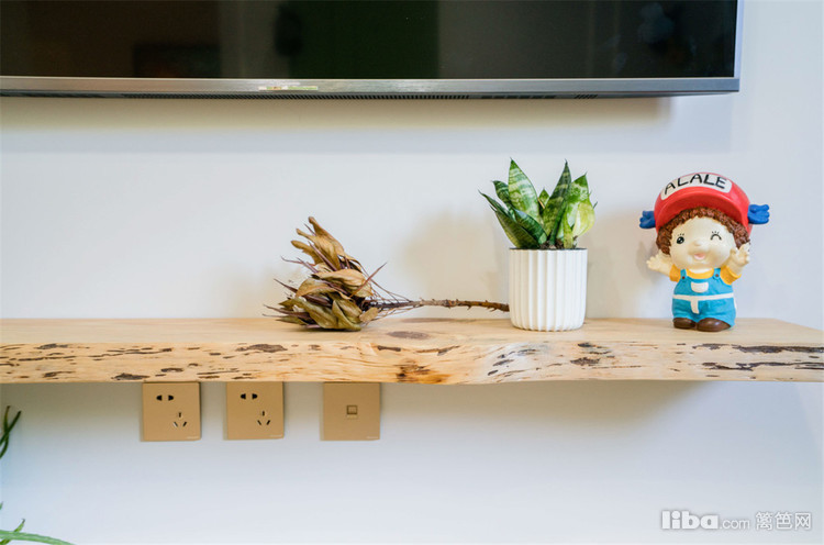 为了让空间不会显得特别拥堵,因此没有选用电视柜的摆放,一块原木自然边的实木板,用一字钉悬挂于墙面