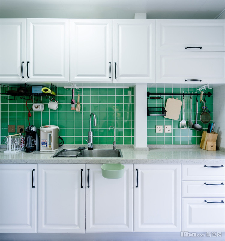 白色吸塑板橱柜黑色把手,搭配墙面水绿色的瓷砖,吊柜下面安装黑色铁艺挂件,可以挂满厨房大大小小的锅铲等厨具。地柜柜门处挂了一个可以放厨房纸巾的小收纳盒,放在水槽边擦手很方便。