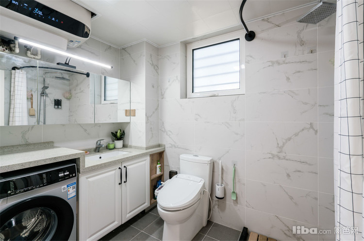 卫生间整体配色,白色自然石材纹理瓷砖,配灰色地面,干净整洁。洗衣机内嵌于石材台面下,与浴室柜结合到一体。