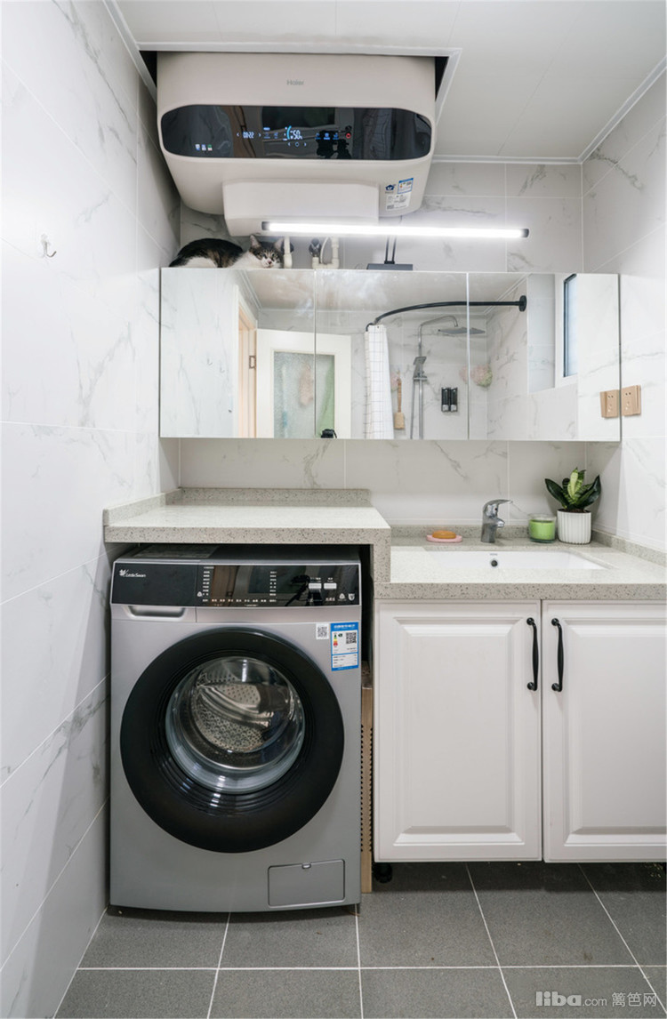 内嵌滚筒洗衣机。因为原顶面管道的问题,电热水器只能悬挂于洗衣机上面