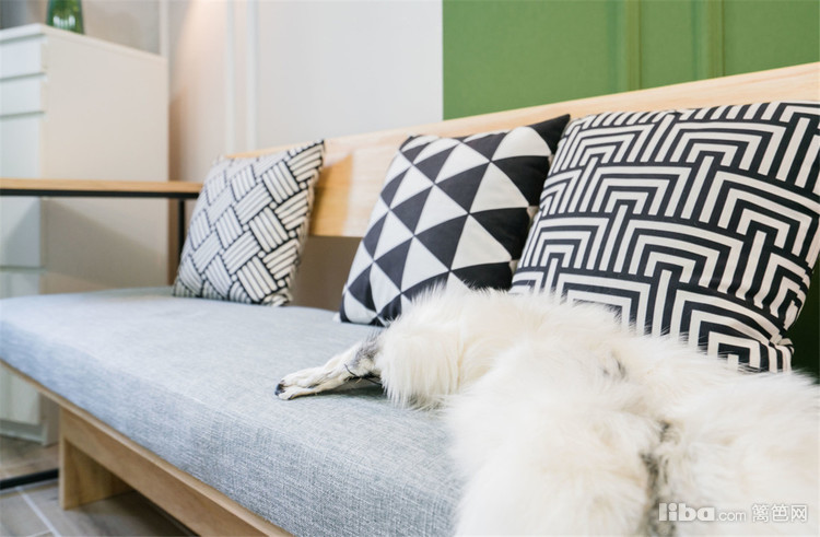 灰色的原木布艺沙发,搭配黑白格子的几何图案靠包,让空间活泼起来